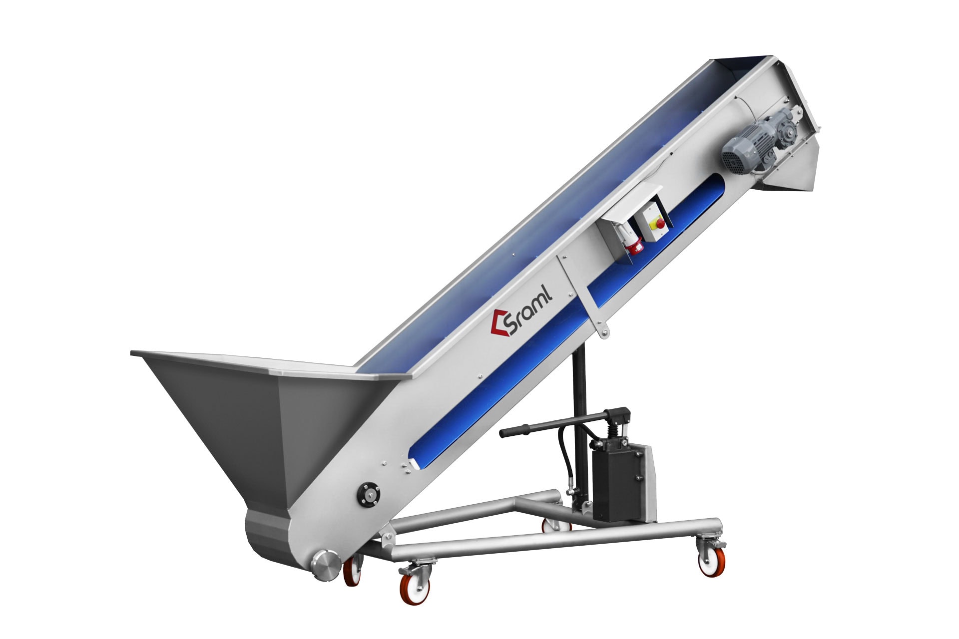 Usually placed before the sorting table, destemmer or press, the SRAML GBE range of grape belt elevators efficiently and gently transports the grapes upwards to a designated processing machine, while the drained juice is collected in the tank attached to the conveyor.