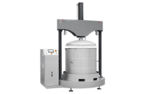 Large horizontal drum with an internal inflatable membrane. The drum can rotate; the bladder inflates and deflates in steps to apply uniform pressure. Computer control lets you set pressure, hold time and rotation for repeatable cycles.